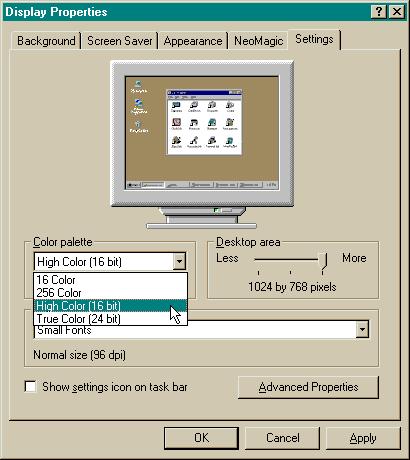 Due to a bug in Windows 95/98, if you are running your system at 8-bit color, you will experience reduced image quality in imagery viewed in the MrSID Online Viewer. To preserve image quality, change your system to 16-bit color or better. To do so, open your Display control panel and select the Settings tab.